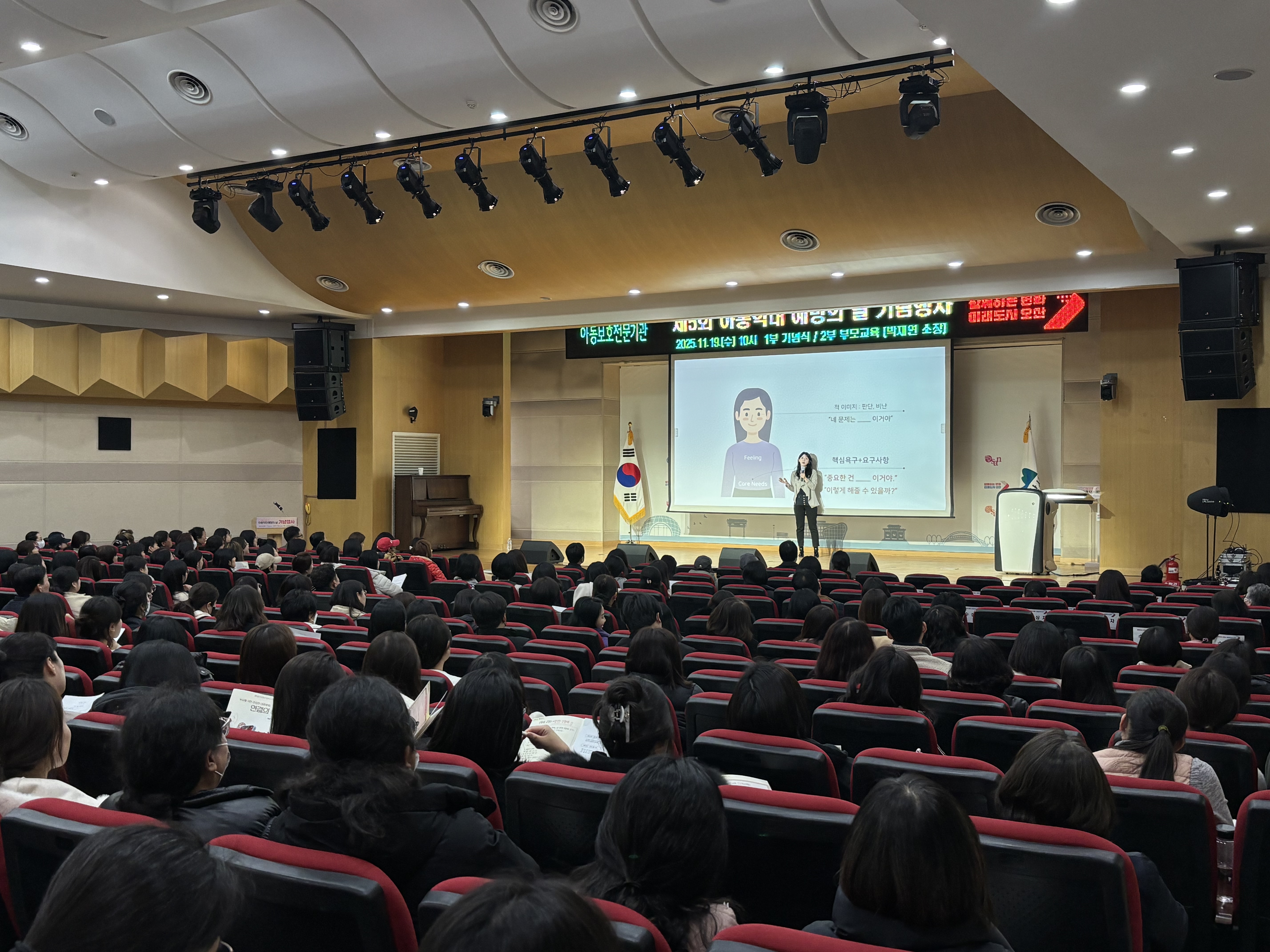 경기도거점아동보호전문기관은 11월 19일 아동학대예방의 날을 기념하여 오산시아동보호전문기관과 함께 대규모 부모교육을 진행했습니다. 해당 교육은 일반 부모를 대상으로 아동학대의 심각성과 예방의 중요성에 대한 사회적 인식개선을 도모하고, 명사 초청 대규모 부모교육을 통해 올바른 양육 태도 함양과 건강한 가족문화 확산하고자 진행되었습니다.