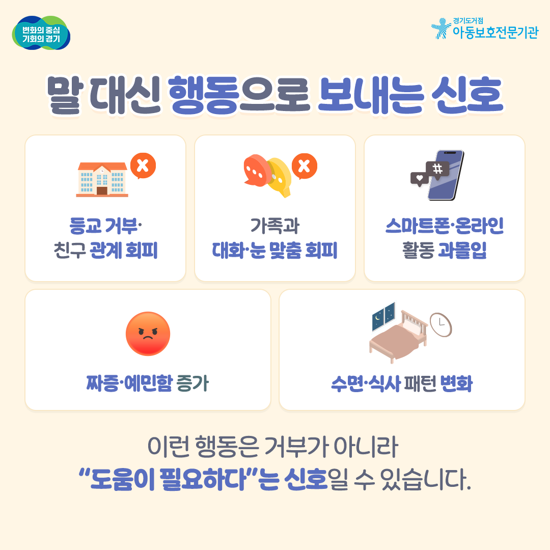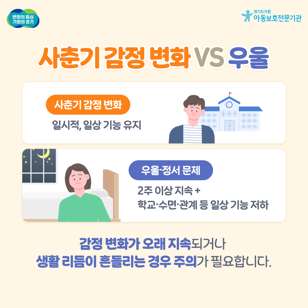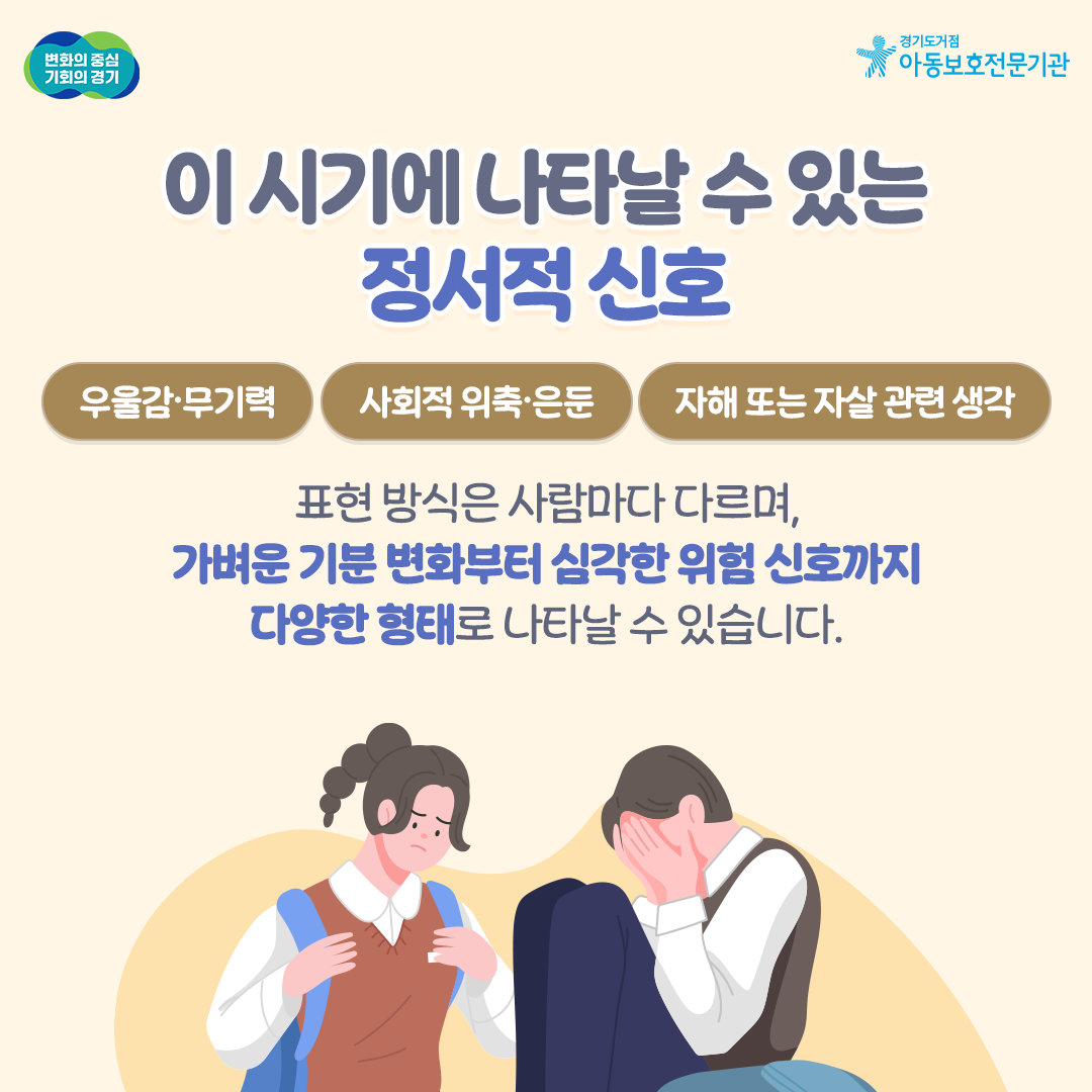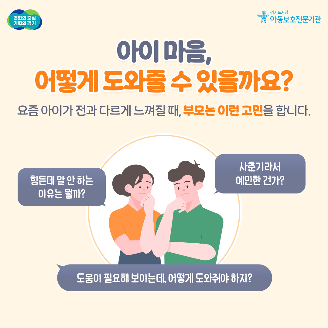 부모와 아이,함께 성장해요청소년기 정서적 어려움부모가 꼭 알아야 할 신호와 대응아이 마음, 어떻게 도와줄 수 있을까요? 요즘 아이가 전과 다르게 느껴질 때,부모는 이런 고민을 합니다“사춘기라서 예민한 건가?”“힘든데 말 안 하는 이유는 뭘까?”“도움이 필요해보이는데,어떻게 도와줘야 하지?”청소년 10명 중 2.7명, 최근 1년간 우울감 경험최근 조사에서 청소년 약 27.7%가지난 1년간 우울감을 경험한 적이 있다고 보고되었습니다.청소년기는정서 조절 기능이 완전히 성숙하지 않아감정이 오래 머물고 흔들리기 쉬운 시기입니다.출처:질병관리청, 2024 청소년건강행태조사왜 감정이 흔들릴까요?• 신체·호르몬의 급격한 변화• 감정·충동 조절 기능의 미성숙• 자아정체감 형성 과정이 시기의 예민함과 기분 변화는성장 과정에서 나타날 수 있는 자연스러운 반응입니다. 사춘기 감정 변화 VS 우울 • 사춘기 감정변화: 일시적, 일상 기능 유지• 우울·정서 문제: 2주 이상 지속 + 학교·수면·관계 등 일상 기능 저하감정 변화가 오래 지속되거나생활 리듬이 흔들리는 경우 주의가 필요합니다. 이 시기에 나타날 수 있는 정서적 신호• 우울감·무기력• 사회적 위축·은둔• 자해 또는 자살 생각 보고 표현 방식은 사람마다 다르며,가벼운 기분 변화부터심각한 위험 신호까지다양한 형태로 나타날 수 있습니다.말 대신 행동으로 보내는 신호• 등교 거부·친구 관계 회피• 가족과 대화·눈 맞춤 회피• 스마트폰·온라인 활동 과몰입• 짜증·예민함 증가• 수면·식사 패턴 변화