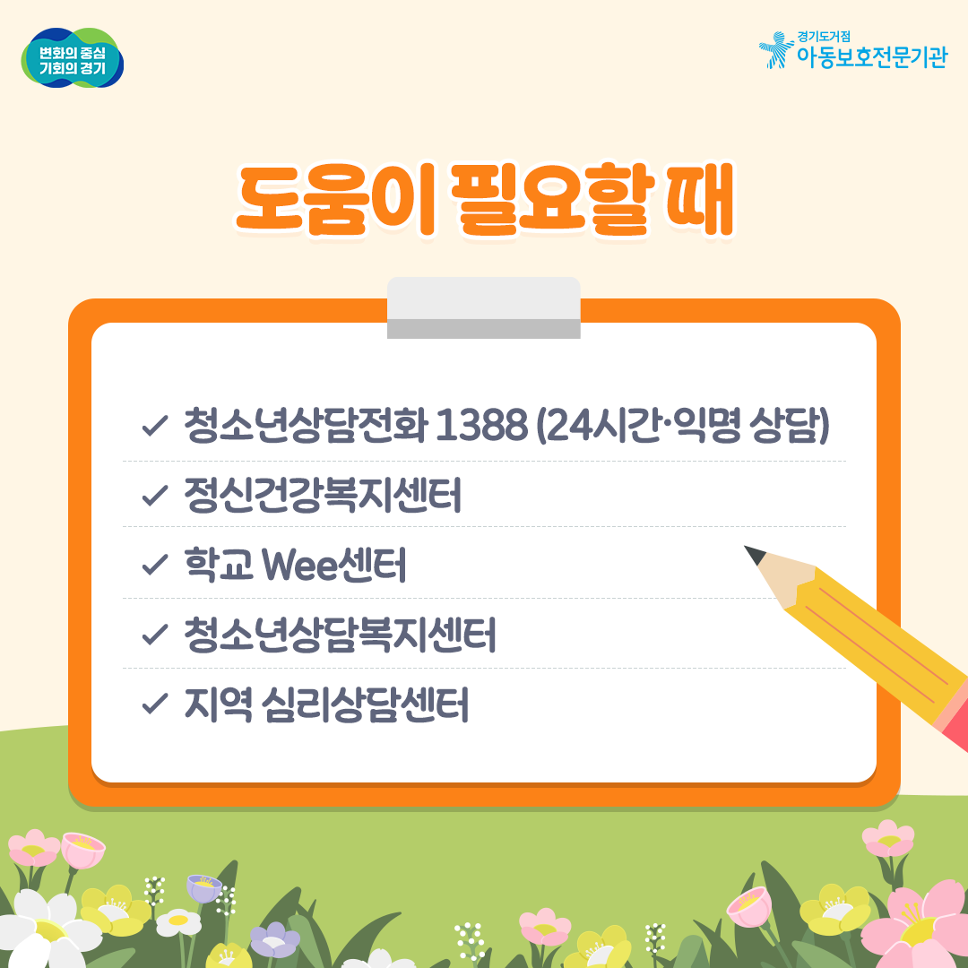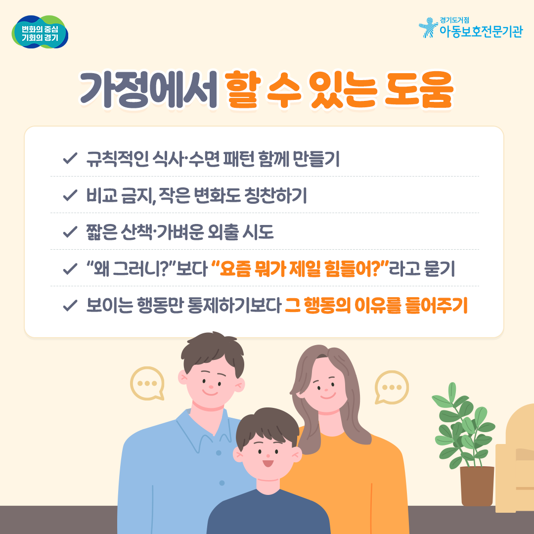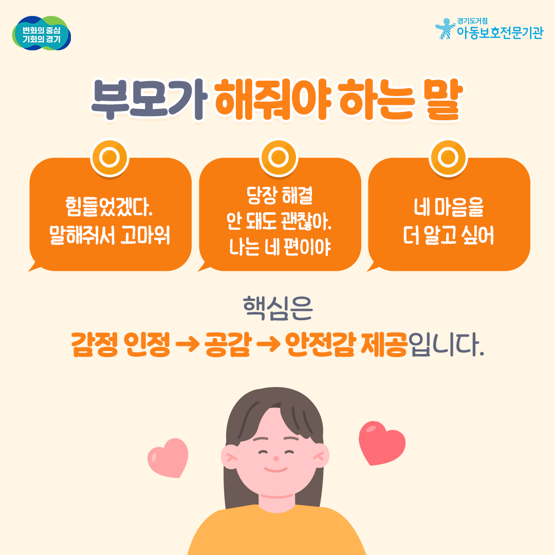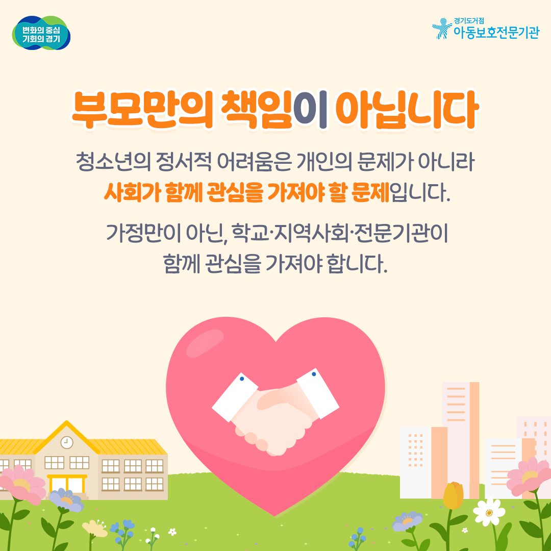 부모와 아이,함께 성장해요청소년기 정서적 어려움부모가 꼭 알아야 할 신호와 대응아이 마음, 어떻게 도와줄 수 있을까요? 요즘 아이가 전과 다르게 느껴질 때,부모는 이런 고민을 합니다“사춘기라서 예민한 건가?”“힘든데 말 안 하는 이유는 뭘까?”“도움이 필요해보이는데,어떻게 도와줘야 하지?”청소년 10명 중 2.7명, 최근 1년간 우울감 경험최근 조사에서 청소년 약 27.7%가지난 1년간 우울감을 경험한 적이 있다고 보고되었습니다.청소년기는정서 조절 기능이 완전히 성숙하지 않아감정이 오래 머물고 흔들리기 쉬운 시기입니다.출처:질병관리청, 2024 청소년건강행태조사왜 감정이 흔들릴까요?• 신체·호르몬의 급격한 변화• 감정·충동 조절 기능의 미성숙• 자아정체감 형성 과정이 시기의 예민함과 기분 변화는성장 과정에서 나타날 수 있는 자연스러운 반응입니다. 사춘기 감정 변화 VS 우울 • 사춘기 감정변화: 일시적, 일상 기능 유지• 우울·정서 문제: 2주 이상 지속 + 학교·수면·관계 등 일상 기능 저하감정 변화가 오래 지속되거나생활 리듬이 흔들리는 경우 주의가 필요합니다. 이 시기에 나타날 수 있는 정서적 신호• 우울감·무기력• 사회적 위축·은둔• 자해 또는 자살 생각 보고 표현 방식은 사람마다 다르며,가벼운 기분 변화부터심각한 위험 신호까지다양한 형태로 나타날 수 있습니다.말 대신 행동으로 보내는 신호• 등교 거부·친구 관계 회피• 가족과 대화·눈 맞춤 회피• 스마트폰·온라인 활동 과몰입• 짜증·예민함 증가• 수면·식사 패턴 변화