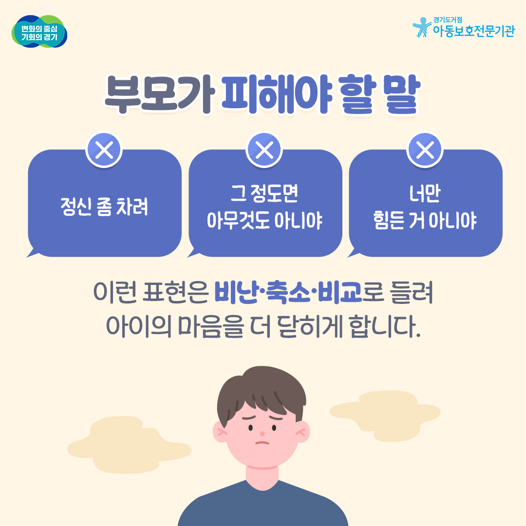 이런 행동은 거부가 아니라즉각 대응이 필요한 위험 신호다음과 같은 경우는일상적인 고민 수준을 넘어선 신호입니다.• 자해 관련 글·이미지 접촉/공유• “나는 없어져도 돼” 같은 발언• 자살·죽음 관련 반복 검색• 소중한 물건 정리·마지막 인사이런 신호가 보이면즉시 전문가의 도움을 요청하세요“도움이 필요하다”는 신호일 수 있습니다.부모가 피해야 할 말X “정신 좀 차려”X “너만 힘든 거 아니야”X “그 정도면 아무것도 아니야”이런 표현은비난·축소·비교로 들려아이의 마음을 더 닫히게 합니다.부모가 해줘야 하는 말